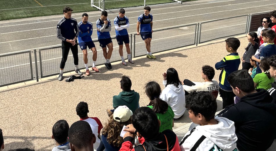 Alumnos del colegio Rey Juan Carlos I ha estado han mantenido esta semana un encuentro en el polideportivo Antonio Sanchez con los jugadores Nico, Grillo, Héctor, Alvarito y Salido, de La Unión Atlético.