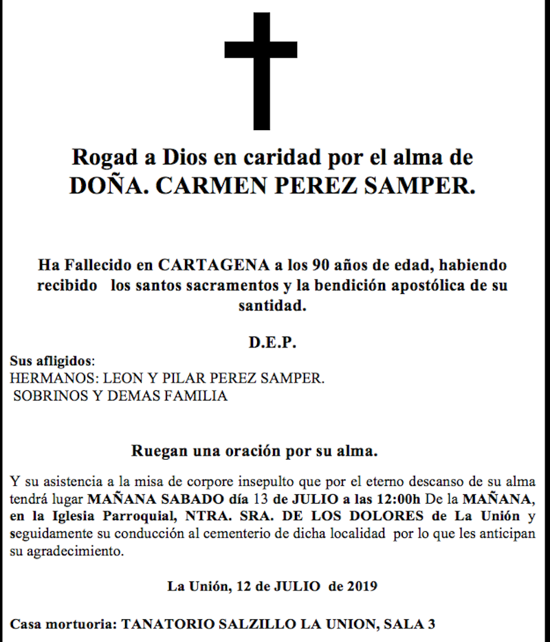 Ha fallecido en Cartagena a los 90 años de edad, habiendo recibido los santos sacramentos y la bendición apostólica de su santidad.