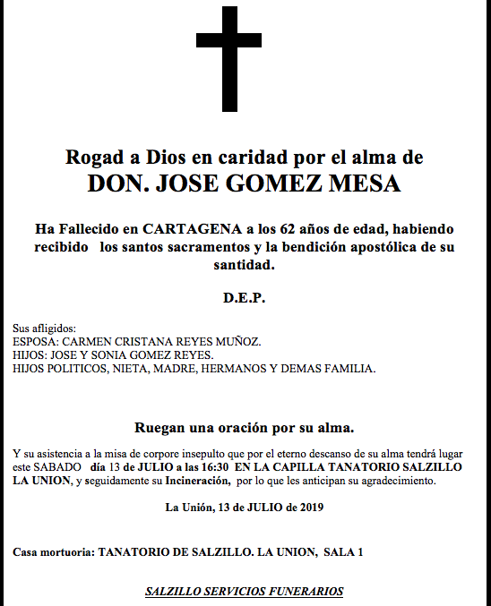 Sus afligidos esposa (Carmen Cristana Reyes Muñoz), hijos (José y Sonia), hijos políticos, nieta, madre, hermanos y demás familia ruegan una oración por su alma y su asistencia a la misa de corpore insepulto que por el eterno descanso de su alma tendrá lugar hoy, sábado 13 de julio, a las 16:30 horas en la capilla del tanatorio Salzillo La Unión, y seguidamente su incineración, por lo que les anticipan su agradecimiento.