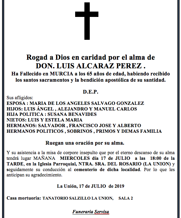 Sus afligidos esposa (María de los Ángeles Salvago González), hijos (Luis Ángel, Alejandro y Manuel Carlos), hija política (Susana Benavides), nietos (Luis y Estela María), hermanos (Salvador, Francisco José y Alberto), hermanos políticos, sobrinos, primos y demás familia ruegan una oración por su alma y su asistencia a la misa de corpore insepulto que por el eterno descanso de su alma tendrá lugar este miércoles, día 17 de julio, a lasÂÂ 18.00 horas de la tarde, en la iglesia parroquial de Nuestra Señora del Rosario de La Unión y seguidamente su conducción al cementerio de dicha localidad, por lo que les anticipan su agradecimiento.