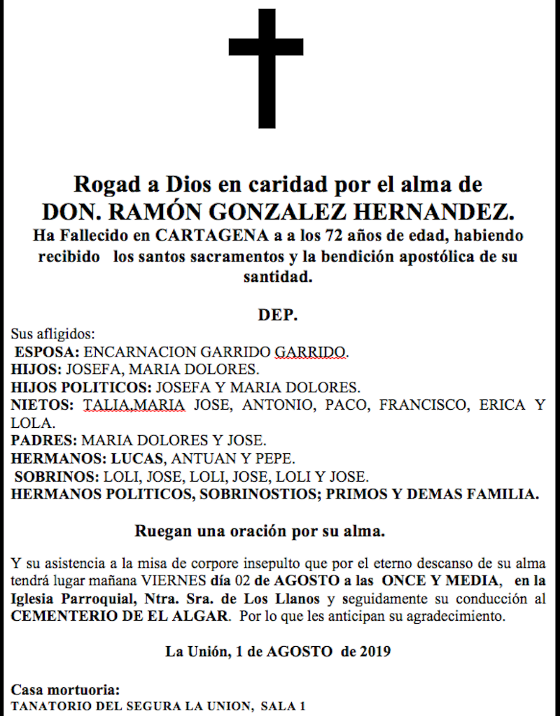 Sus afligidos esposa (Encarnación Garrido Garrido), hijos (Josefa y María Dolores), hijos políticos (Josefa y María Dolores), nietos (Talia, María José, Antonio, Paco, Francisco, Erica y Lola), padres (María Dolores y José) hermanos (Lulcas, Antuán y Pepe), sobrinos (Loli, José, Loli, José, Loli y José), hermanos políticos, sobrinotíos, primos y demás familia ruegan una oración por su alma y su asistencia a la misa de corpore insepulto que por el eterno descanso de su alma tendrá lugar este viernes, día 2 de agosto, a las once y media horas en la iglesia parroquial de Nuestra Señora de los Llanos y seguidamente su conducción al cementerio de El Algar, por lo que les anticipan su agradecimiento.