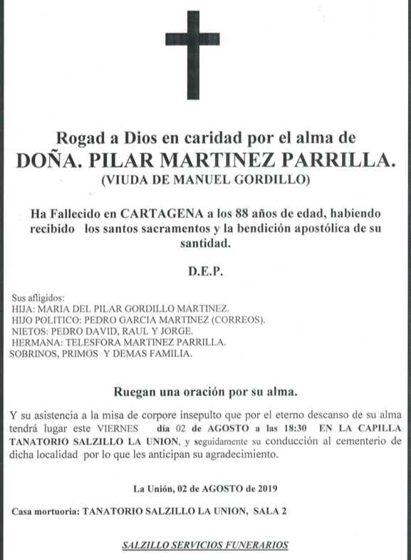 Sus afligidos hija (María del Pilar Gordillo Martínez), hijo político (Pedro García Martínez - Correos), nietos (Pedro David, Raúl y Jorge), hermana (Telesfora), sobrinos, primos y demás familia ruegan una oración por su alma y su asistencia a la misa de corpore insepulto que por el eterno descanso de su alma tendrá lugar este viernes, 2 de agosto, a las 18.30 horas, en la capilla tanatorio Salzillo de La Unión, y seguidamente su conducción al cementerio de la localidad, por lo que les anticipan su agradecimiento.