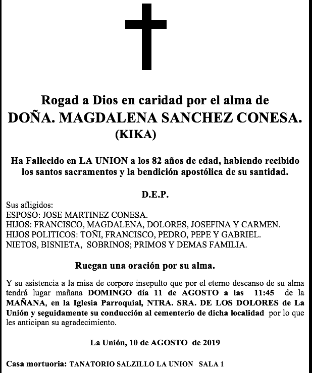 Sus afligidos esposo (José Martínez Conesa), hijos (Francisco, Magdalena, Dolores, Josefina y Carmen), hijos políticos (Toñi, Francisco, Pedro, Pepe y Gabriel), nietos, bisnieta, sobrinos, primos y demás familia ruegan una oración por su alma y su asistencia a la misa de corpore insepulto que por el eterno descanso de su alma tendrá lugar este domingo, once de agosto, a las 11:45 de la mañana en la iglesia parroquial de Nuestra Señora de los Dolores de La Unión y seguidamente su conducción al cementerio de dicha localidad, por lo que les anticipan su agradecimiento.