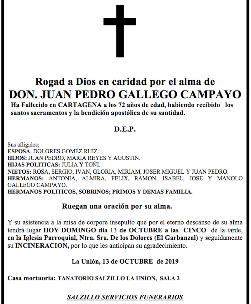 Sus afligidos esposa (Dolores Gómez Ruiz), hijos (Juan Pedro, María Reyes y Agustín), hijas políticas (Julia y Toñi), nietos (Rosa, Sergio, Iván, Gloria, Miriam, José Miguel y Juan Pedro), hermanos (Antonia, Almira, Félix, Ramón, Isabel, José y Manolo), hermanos políticos, sobrinos, primos y demás familia ruegan una oración por su alma y su asistencia a la misa de corpore insepulto que por el eterno descanso de su alma tendrá lugar hoy, domingo día 13 de octubre, a las cinco de la tarde, en la iglesia parroquia de Nuestra Señora de los Dolores (El Garbanzal) y seguidamente su incineración, por lo que les anticipan su agradecimiento.