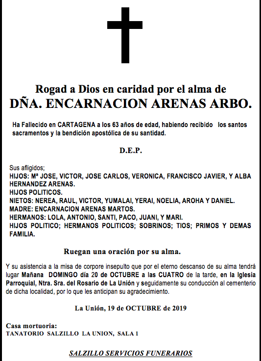 Sus afligidos hijos (María José, Víctor, José Carlos, Verónica, Francisco Javier y Alba Hernández), hijos políticos, nietos (Nerea, Raúl, Víctor, Yumalai, Yerai, Noelia, Aroha y Daniel), madre (Encarnación Arenas Martos), hermanos (Lola, Antonio, Santi, Paco, Juani y Mari), hijos políticos, hermanos políticos, sobrinos, tíos, primos y demás familia ruegan una oración por su alma y su asistencia a la misa de corpore insepulto que por el eterno descanso de su alma tendrá lugar este domingo, día 20 de octubre a las cuatro horas de la tarde, en la iglesia parroquial Nuestra Señora del Rosario de La Unión y seguidamente su conducción al cementerio de dicha localidad, por lo que les anticipan su agradecimiento.