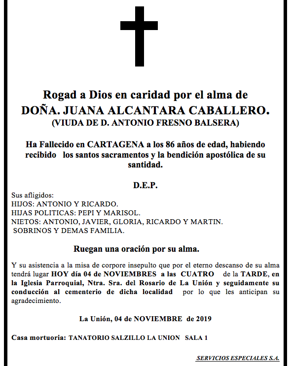 Sus afligidos hijos (Antonio y Ricardo), hijas políticas (Pepi y Marisol), nietos (Antonio, Javier, Gloria, Ricardo y Martín), sobrinos y demás familia ruegan una oración por su alma y su asistencia a la misa de corpore insepulto que por el eterno descanso de su alma tendrá lugar este lunes, 4 de noviembre, a las cuatro de la tarde en la iglesia parroquial de Nuestra Señora del Rosario de La Unión y seguidamente su conducción al cementerio de dicha localidad  por lo que les anticipan su agradecimiento.