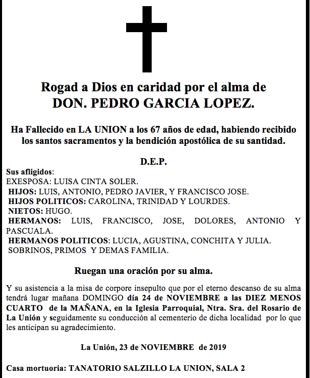 Sus afligidos exesposa (Luisa Cinta Soler), hijos (Luis, Antonio, Pedro Javier y Francisco José), hijos políticos (Carolina, Trinidad y Lourdes), nieto (Hugo), hermanos (Luis, Francisco, José, Dolores, Antonio y Pascuala), hermanos políticos (Lucía, Agustina, Conchita y Julia), sobrinos, primos y demás familia ruegan una oración por su alma y su asistencia a la misa de corpore insepulto que por el eterno descanso de su alma tendrá lugar este domingo, día 24 de novimebre a las diez menos cuarto de la mañana, en la iglesia parroquial de Nuestra Señora del Rosario de La Unión y seguidamente su conducción al cementerio de dicha localidad, por lo que les anticipan su agradecimiento.