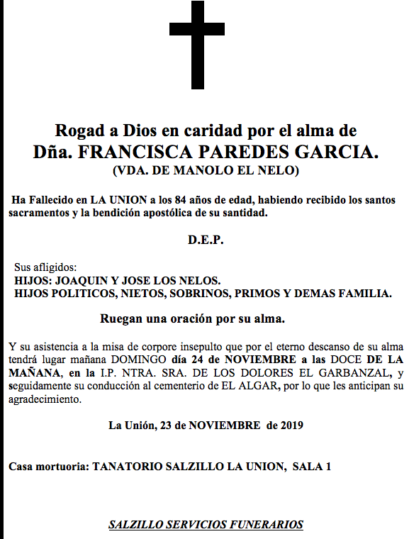 Sus afligidos hijos (Joaquín y José 'Los Nelos'), hijos políticos, nietos, sobrinos, primos y demás familia ruegan una oración por su alma y su asistencia a la misa de corpore insepulto que por el eterno descanso de su alma tendrá lugar este domingo, día 24 de noviembre, a las doce la mañana, en la iglesia parroquial de Nuestra Señora de los Dolores de El Garbanzal, y seguidamente su conducción al cementerio de El Algar, por lo que les anticipan su agradecimiento.