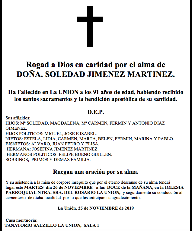Sus afligidos hijos (María Soledad, Magdalena, María del Carmen, Fermín y Antonio Díaz Giménez, hijos políticos (Miguel, José e Isabel), nietos (Estela, Lidia, Carmen, Marta, Belén, Fermín, Marina y Pablo), bisnietos (Álvaro, Juan Pedro y Elisa), hermana (Josefina), hermano político (Felipe Bueno Guillén), sobrinos, primos y demás familia ruegan una oración por su alma y su asistencia a la misa de corpore insepulto que por el eterno descanso de su alma tendrá lugar este martes, día 26 de noviembre a las doce horas de la mañana, en la iglesia parroquial de Nuestra Señora del Rosario de La Unión y seguidamente su conducción al cementerio de dicha localidad, por lo que les anticipan su agradecimiento.