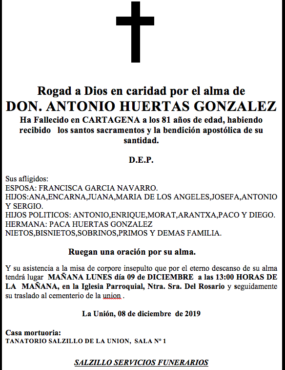 Sus afligidos esposa (Francisca García Navarro), hijos (Ana, Encarna, Juana, María de los Ángeles, Josefa, Antonio y Sergio), hijos políticos (Antonio, Enrique, Morat, Arantxa, Paco y Diego), hermana (Paca), nietos, bisnietos, sobrinos, primos y demás familia ruegan una oración por su alma y su asistencia a la misa de corpore insepulto que por el eterno descanso de su alma tendrá lugar este lunes, día 9 de diciembre, a las 13:00 horas, en la iglesia parroquial de Nuestra Señora del Rosario y seguidamente su traslado al cementerio de La Unión.