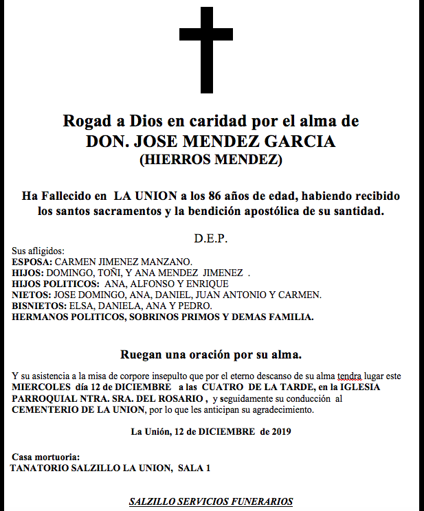 Sus afligidos esposa (Carmen Jiménez Manzano), hijos (Domingo, Toñi y Ana), hijos políticos (Ana, Alfonso y Enrique), nietos (José Domingo, Ana, Daniel, Juan Antonio y Carmen), bisnietos (Elsa, Daniela, Ana y Pedro), hermanos políticos, sobrinos, primos y demás familia ruegan una oración por su alma y su asistencia a la misa de corpore insepulto que por el eterno descanso de su alma tendra lugar este miércoles, 12 de diciembre, a las cuatro de la tarde en la iglesia parroquia de Nuestra Señora del Rosario y seguidamente su conducción al cementerio de La Unión, por lo que les anticipan su agradecimiento.