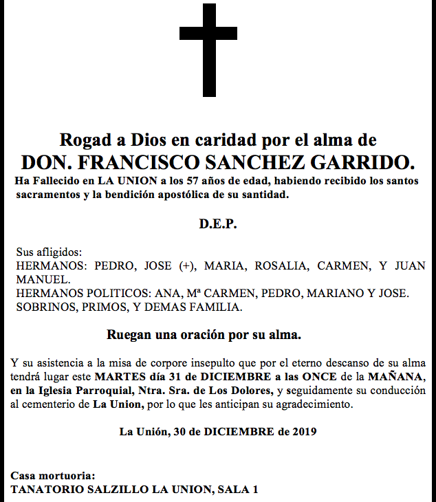 Sus afligidos hermanos )Pedro, José (+), María, Rosalía, Carmen y Juan Manuel), hermanos políticos (Ana, María del Carmen, Pedro, Mariano y José), sobrinos, primos y demás familia ruegan una oración por su alma y su asistencia a la misa de corpore insepulto que por el eterno descanso de su alma tendrá lugar este martes, día 31 de diciembre, a las once de la mañana, en la iglesia parroquial de Nuestra Señora de Los Dolores y seguidamente su conducción al cementerio de La Union, por lo que les anticipan su agradecimiento.