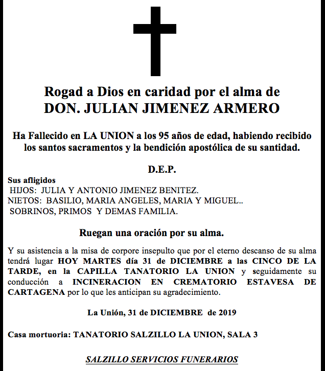 Sus afligidos hijos (Julia y Antonio Jiménez Benítez), nietos (Basilio, María Ángeles, María y Miguel), sobrinos, primos y demás familia ruegan una oración por su alma y su asistencia a la misa de corpore insepulto que por el eterno descanso de su alma tendrá lugar hoy, martes 31 de diciembre, a las cinco de la tarde, en la capilla del tanatorio de La Unión y seguidamente su conducción a incineración en crematorio Estavesa de Cartagena, por lo que les anticipan su agradecimiento.
