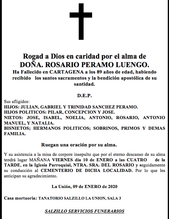 Sus afligidos hijos (Julián, Gabriel y Trinidad Sánchez Peramo), hijos políticos (Pilar, Concepción y José), nietos (José, Isabel, Noelia, Antonio, Rosario, Antonio Manuel y Natalia), bisnietos, hermanos políticos, sobrinos, primos y demás familia ruegan una oración por su alma y su asistencia a la misa de corpore insepulto que por el eterno descanso de su alma tendrá lugar este viernes, día 10 de enero, a las cuatro de la tarde, en la iglesia parroquial de Nuestra Señora del Rosario y, seguidamente, su conducción al cementerio de dicha localidad, por lo que les anticipan su agradecimiento.