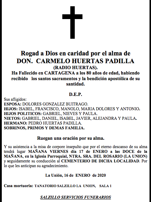 Sus afligidos esposa (Dolores González Buitrago), hijos (Isabel, Francisco, Manolo, María Dolores y Antonio), hijos políticos (Gabriel, Nieves y Paula), nietos (Gabriel, Daniel, Isabel, Javier, Alejandra y Paula), hermano (Pedro), sobrinos, primos y demás familia ruegan una oración por su alma y su asistencia a la misa de corpore insepulto que por el eterno descanso de su alma tendrá lugar este viernes, día 17 de enero, a las doce de la mañana en la iglesia parroquial de Nuestra Señora del Rosario de La Unión, y seguidamente su conducción al cementerio de dicha localidad, por lo que les anticipan su agradecimiento.