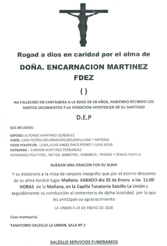 Sus afligidos esposo (Alfonso Martínez González), hijos (Juan Pedro, Encarnación, Dolores, Luisa y Antonia), hijos políticos (Luisa, Julio, Ángel, Paco, Pedro y Juan Jesús), hermana (Carmen), hermanos políticos, nietos, biznietos, sobrinos, primos y demás familia ruegan una oración por su alma y sus asistencia a la misa de corpore insepulto que por el eterno descanso de su alma tendrá lugar este sábado, 25 de enero, a las 11 horas, en la capilla del tanatorio Salzillo La Unión y seguidamente su conducción al cementerio de dicha localidad, por lo que les anticipan su agradecimiento.