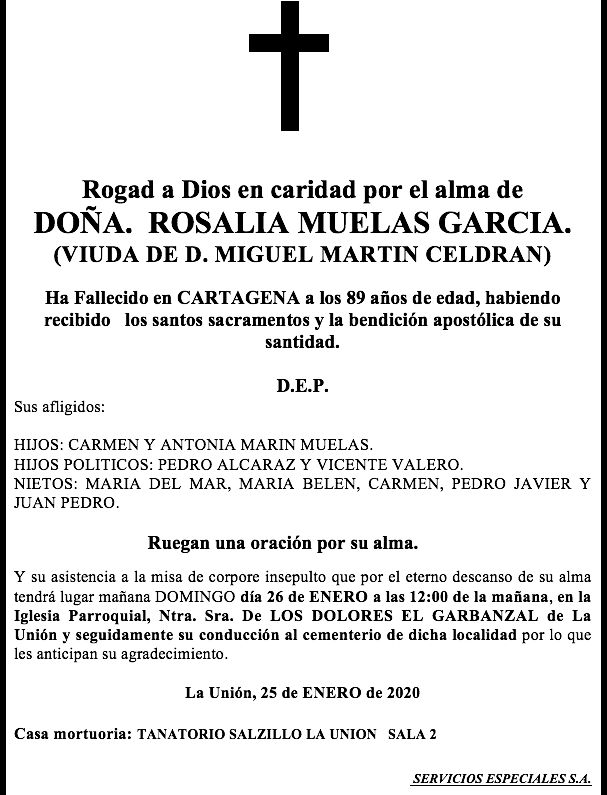 Sus afligidos hijos (Carmen y Antonia), hijos políticos (Pedro, Alcaraz y Vicentge Valero), nietos (María del Mar, María Belén, Carmen, Pedro Javier y Juan Pedro) ruegan una oración por su alma y su asistencia a la misa de corpore insepulto que por el eterno descanso de su alma tendrá lugar este domingo, día 26 de enero, a las 12.00 horas de la mañana, en la iglesia parroquial de Nuestra Señora de los Dolores de El Garbanzal de La Unión y seguidamente su conducción al cementerio de dicha localidad, por lo que les anticipan su agradecimiento.