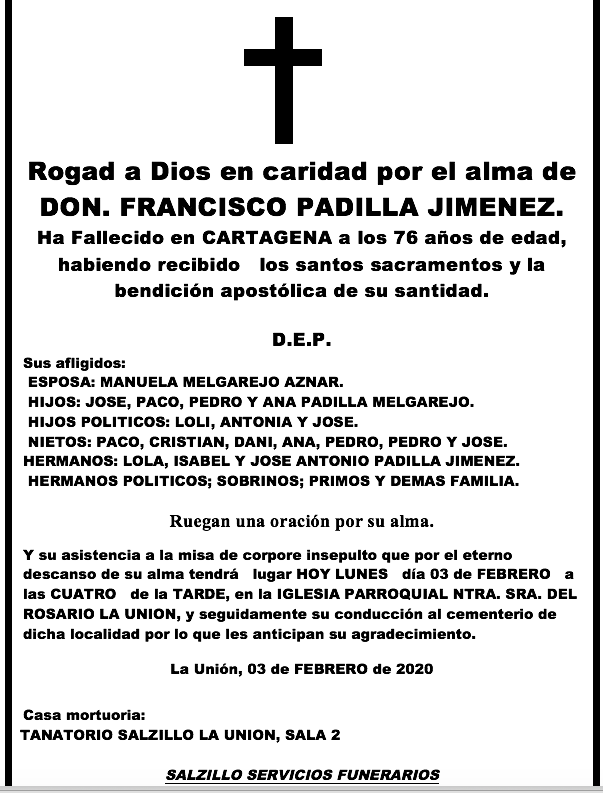 Sus afligidos esposa Manuel Melgarejo Aznar), hijos (José, Paco, Pedro y Ana), hijos políticos (Loli, Antonia y José), nietos (Paco, Cristian, Dani, Ana, Pedro, Pedro y José), hermanos (Lola, Isabel y José Antonio), hermanos políticos, sobrinos, primos y demás familia ruegan una oración por su alma y su asistencia a la misa de corpore insepulto que por el eterno descanso de su alma tendrá lugar hoy, lunes 3 de febrero, a las cuatro horas de la tarde en la iglesia parroquial de Nuestra Señora del Rosario de La Unión, y seguidamente su conducción al cementerio de dicha localidad, por lo que les anticipan su agradecimiento.