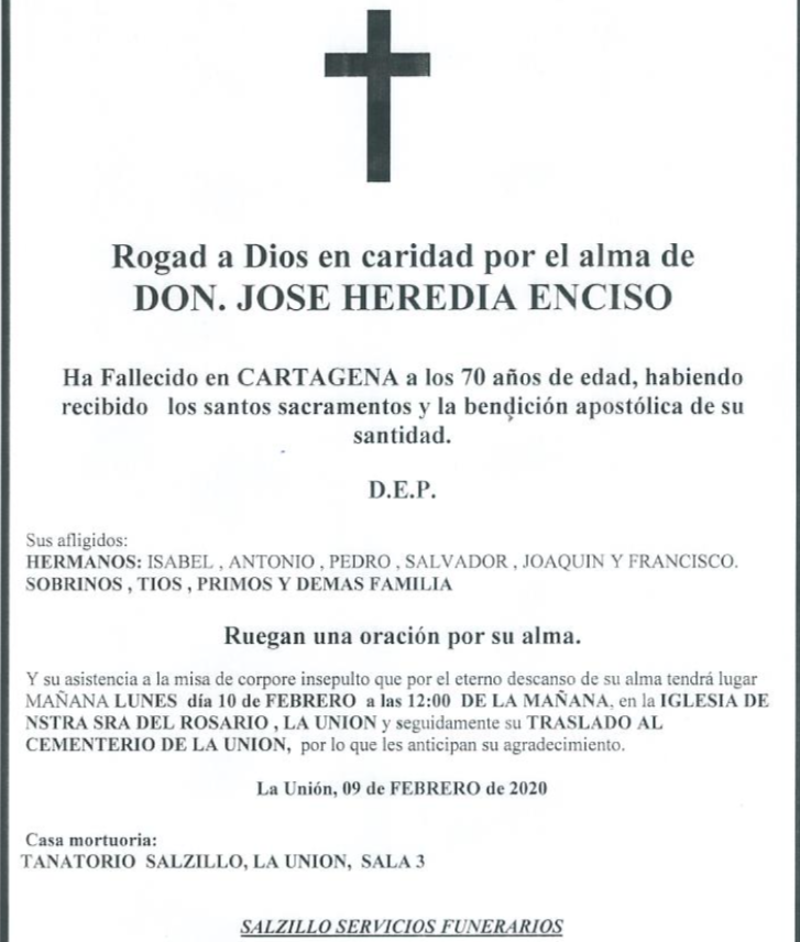 Sus afligidos hermanos (Isabel, Antonio, Pedro, Salvador, Joaquín y Francisco), sobrinos, tíos, primos y demás familia ruegan una oración por su alma y sus asistencia a la misa de corpore insepulto que por el eterno descanso de su alma tendrá lugar este lunes, 10 de febrero, a las 12 horas de la mañana, tendrá lugar en la iglesia de Nuestra Señora del Rosario, y seguidametne su traslado al cementerio de La Unión, por lo que les anticipan su agradecimiento.