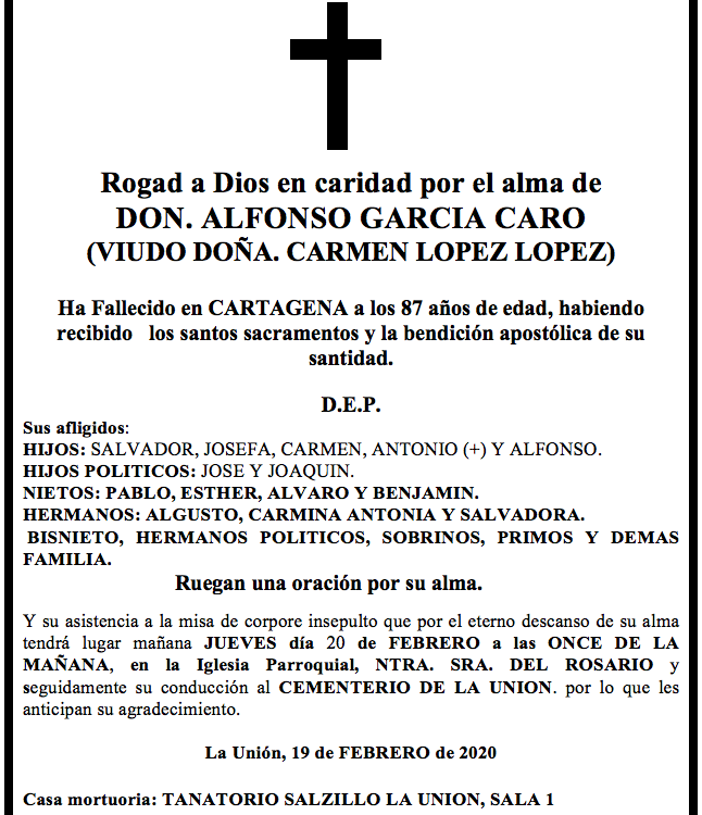 Sus afligidos hijos (Salvador, Josefa, Carmen, Antonio+ y Alfonso9, hijos políticos (José y Joaquín), nietos (Pablo, Esther, Álvaro y Benjamín), hermanos (Augusto, Carmina Antonia y Salvadora), bisnieto, hermanos políticos, sobrinos, primos y demás familia ruegan una oración por su alma y su asistencia a la misa de corpore insepulto que por el eterno descanso de su alma tendrá lugar este jueves, día 20 de febrero, a las once horas de la mañana en la iglesia parroquia de Nuestra Señora del Rosario y seguidamente su conducción al cementerio de La Unión. por lo que les anticipan su agradecimiento.