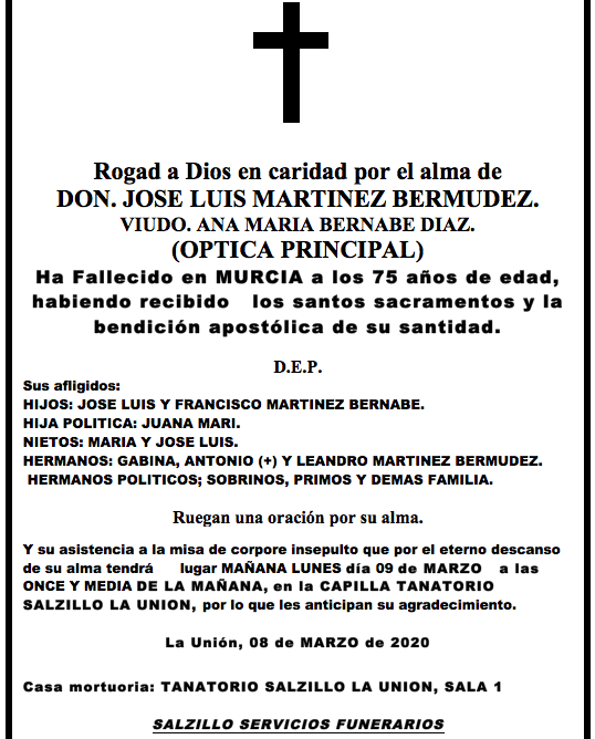 Sus afligidos hijos (José Luis y Francisco), hija política (Juana Mari), nietos (María y José Luis), hermanos (Gabina, Antonio+ y Leandro), hermanos políticos, sobrinos, primos y demás familia ruegan una oración por su alma y su asistencia a la misa de corpore insepulto que por el eterno descanso de su alma tendrá este lunes, 9 de marzo, a las once y media horas de la mañana, en la capilla Tanatorio Salzillo La Unión, por lo que les anticipan su agradecimiento.