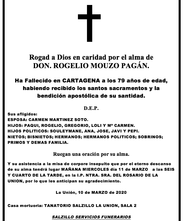 Sus afligidos esposa (Carmen Martínez Soto), hijos (Paqui, Rogelio, Loli y Mª Carmen), hijos políticos (Souleymane, Ana, José, Javi y Pepi), nietos, bisnietos, hermanos, hermanos políticos, sobrinos, primos y demás familia ruegan una oración por su alma y su asistencia a la misa de corpore insepulto que por el eterno descanso de su alma tendrá lugar hoy, miércoles, a las seis y cuarto de la tarde, en la iglesia parroquial de Nuestra Señora del Rosario de La Unión, por lo que les anticipan su agradecimiento.