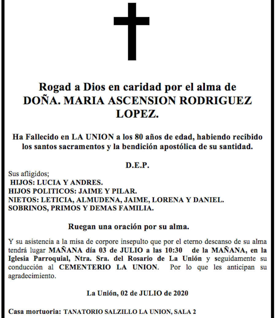 Sus afligidos hijos (Lucía y Andrés), hijos políticos (Jaime y Pilar), nietos (Leticia, Almudena, Jaime, Lorena y Daniel), sobrinos, primos y demás familia ruegan una oración por su alma y su asistencia a la misa de corpore insepulto que por el eterno descanso de su alma tendrá lugar mañana día 3 de julio a las 10.30 horas de la mañana, en la iglesia parroquial de Nuestra Señora del Rosario de La Unión y seguidamente su conducción al cementerio de La Unión, por lo que les anticipan su agradecimiento.