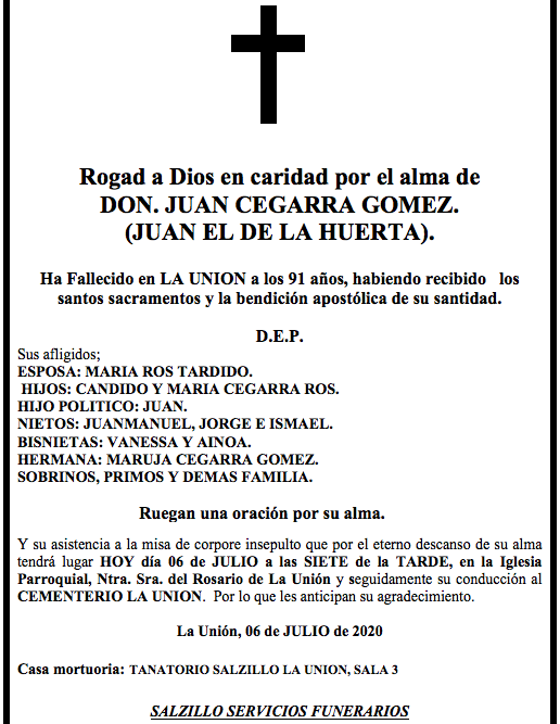 Sus afligidos esposa (María Ros Tardido), hijos (Cándido y María Cegarra Ros), hijo político (Juan), nietos (Juan Manuel, Jorge e Ismael), bisnietas (Vanessa y Ainoa), hermana (Maruja Cegarra Gómez), sobrinos, primos y demás familia ruegan una oración por su alma y su asistencia a la misa de corpore insepulto que por el eterno descanso de su alma tendrá lugar hoy, día 6 de julio a las siete de la tarde, en la iglesia parroquial de Nuestra Señora del Rosario de La Unión y seguidamente su conducción al cementerio de La Unión, por lo que les anticipan su agradecimiento.