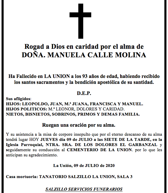 Sus afligidos hijos (Leopoldo, Juan, María Juana, Francisca y Manuel), hijos políticos (María Leonor, Dolores y Caridad), nietos, bisnietos, sobrinos, primos y demás familia ruegan una oración por su alma y su asistencia a la misa de corpore insepulto que por el eterno descanso de su alma tendrá lugar este jueves, 9 de julio, a las siete de la tarde, en la iglesia parroquial de Nuestra Señora de Los Dolores de El Garbanzal y seguidamente su conducción al cementerio de La Unión, por lo que les anticipan su agradecimiento.