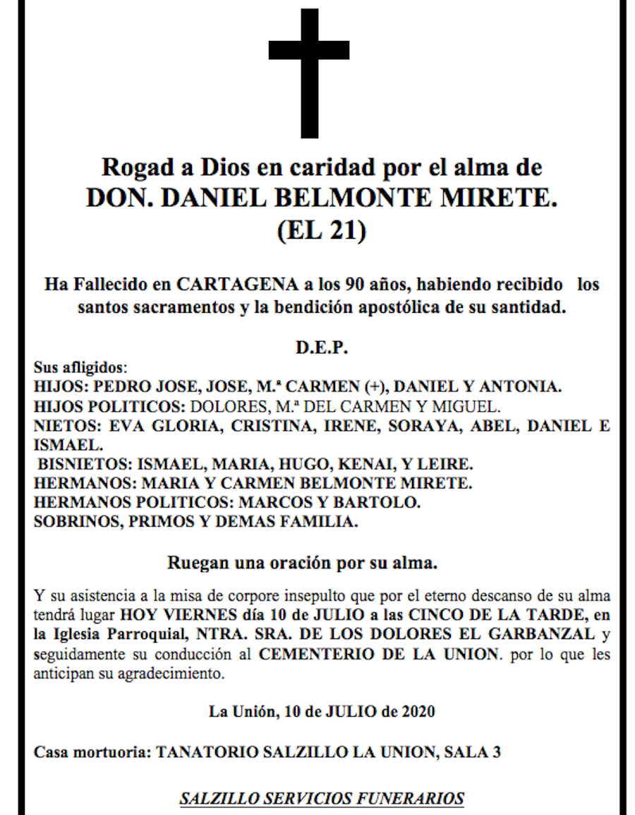 Sus afligidos hijos (Pedro José, José, María del Carmen+, Daniel y Antonia), hijos políticos (Dolores, María del Carmen y Miguel), nietos (Eva Gloria, Cristina, Irena, Soraya, Abel, Daniel e Ismael), bisnietos (Ismael, María, Hugo, Kenai y Leire), hermanos (María y Carmen), hermanos políticos (Marcos y Bartolo), sobrinos, primos y demás familia ruegan una oración por su alma y su asistencia a la misa de corpore insepulto que por el eterno descanso de su alma tendrá lugar hoy, viernes día 10 de julio, a las cinco de la tarde, en la iglesia parroquial de Nuestra Señora de Los Dolores de El Garbanzal y seguidamente su conducción al cementerio de La Unión, por lo que les anticipan su agradecimiento.