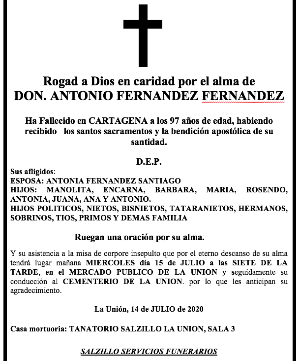 Sus afligidos esposa (Antonia Fernández Santiago), hijos (Manolita, Encarna, Bárbara, María, Rosendo, Antonia, Juana, Ana y Antonio), hijos políticos, nietos, bisnietos, tataranietos, hermanos, sobrinos, tíos, primos y demás familia ruegan una oración por su alma y su asistencia a la misa de corpore insepulto que por el eterno descanso de su alma tendrá lugar este miércoles, día 15 de julio, a las siete de la tarde, en el Mercado Público de La Unión La Unión y seguidamente su conducción al cementerio de La Unión, por lo que les anticipan su agradecimiento.