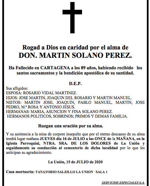Sus afligidos esposa (Rosario Vidal Martínez), hijos (José Martín, Joaquín del Rosario y Martín Manuel), nietos (Martín, José, Joaquín, Pablo Manuel, Martín, José Pedro, María Rosa y Antonio Jesús), hermanas (María, Asunción y Fina), hermano político, sobrinos, primos y demás familia ruegan una oración por su alma y su asistencia a la misa de corpore insepulto que por el eterno descanso de su alma tendrá lugar mañana, jueves día 16 de julio, a las once horas de la mañana, en la iglesia parroquial de Nuestra Señora de los Dolores de El Garbanzal y seguidamente su conducción al cementerio de La Unión, por lo que les anticipan su agradecimiento.