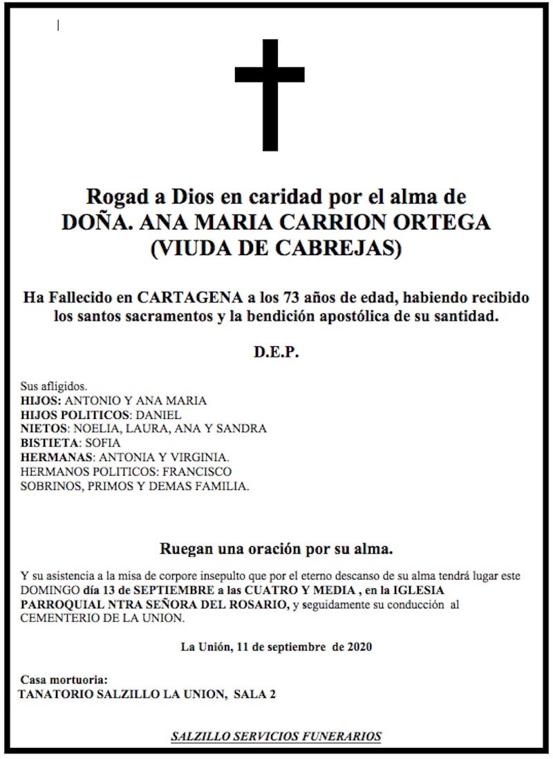 Sus afligidos hijos (Antonio y Ana María), hijo político (Daniel), nietos (Noelia, Laura, Ana y Sandra), bisnieta (Sofía), hermanas (Antonia y Virginia), hermano político (Francisco), sobrinos, primos y demás familia ruegan una oración por su alma y su asistencia a la misa de corpore insepulto que por el eterno descanso de su alma tendrá lugar este domingo, día 13 de septiembre a las cuatro y media de la tarde, en la iglesia parroquial de Nuestra Señora del Rosario y seguidamente su conducción cementerio de La Unión.