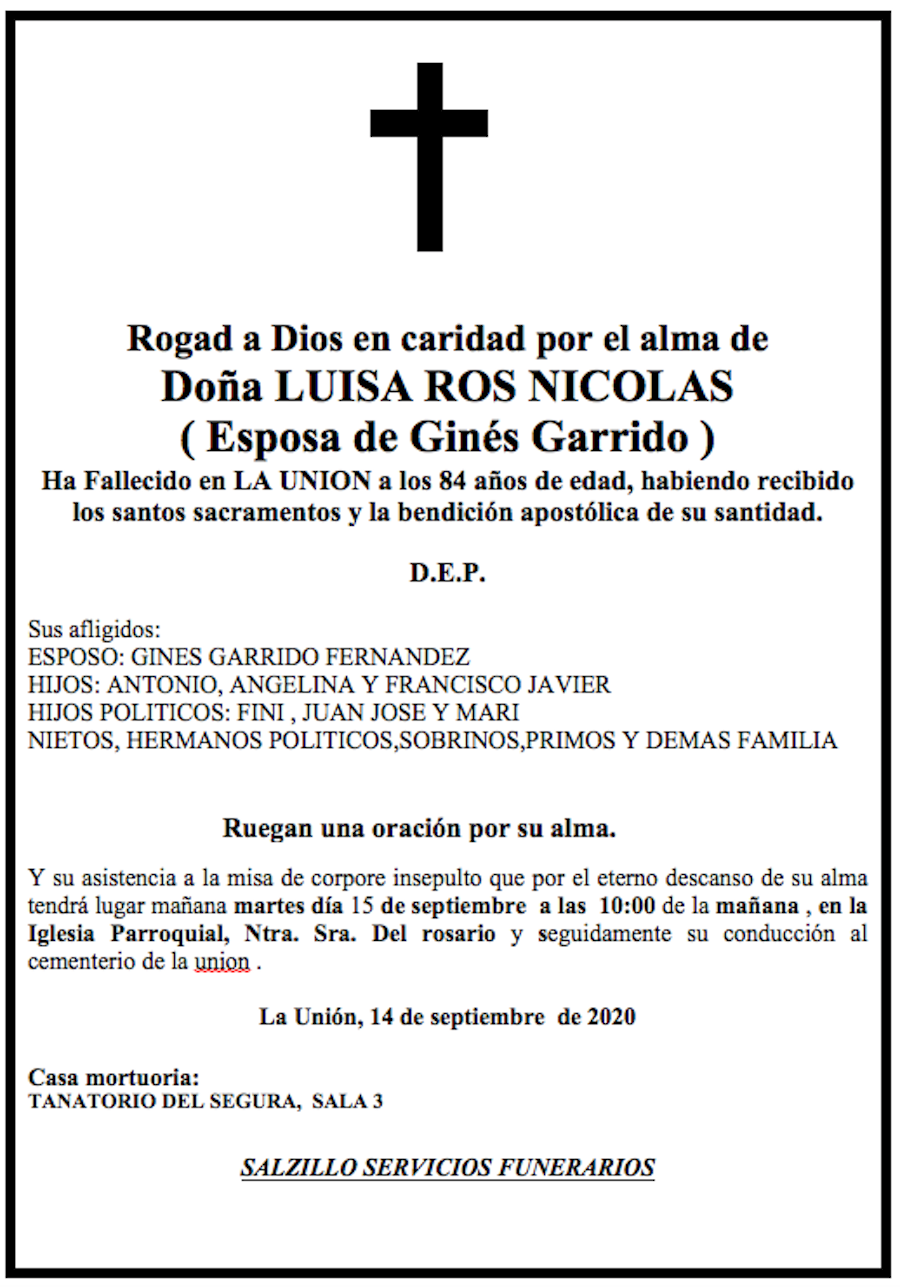 Sus afligidos esposo (Ginés Garrido Fernández), hijos (Antonio, Angelina y Francisco Javier), hijos políticos (Fini, Juan José y Mari), nietos, hermanos políticos, sobrinos, primos y demás familia ruegan una oración por su alma y su asistencia a la misa de corpore insepulto que por el eterno descanso de su alma tendrá lugar este martes, día 15 de septiembre a las 10 horas de la mañana, en la iglesia parroquia de Nuestra Señora del Rosario y seguidamente su conducción al cementerio de La Unión.