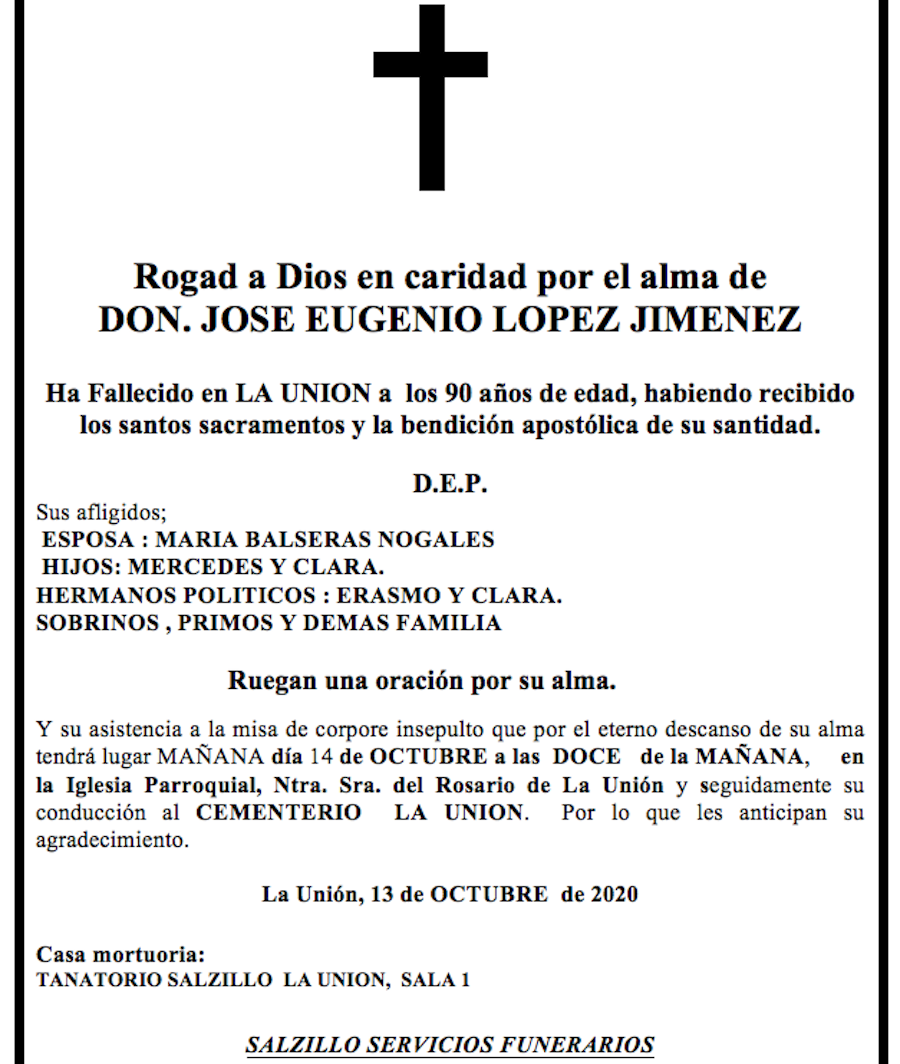 Sus afligidos esposa (María Balseras Nogales), hijos (Mercedes y Clara), hermanos políticos (Erasmo y Clara), sobrinos, primos y demás familia ruegan una oración por su alma y su asistencia a la misa de corpore insepulto que por el eterno descanso de su alma tendrá lugar este miércoles, día 14 de octubre, a las doce horas en la iglesia parroquial de Nuestra Señora del Rosario de La Unión y seguidamente su conducción al cementerio de La Unión, por lo que les anticipan su agradecimiento.