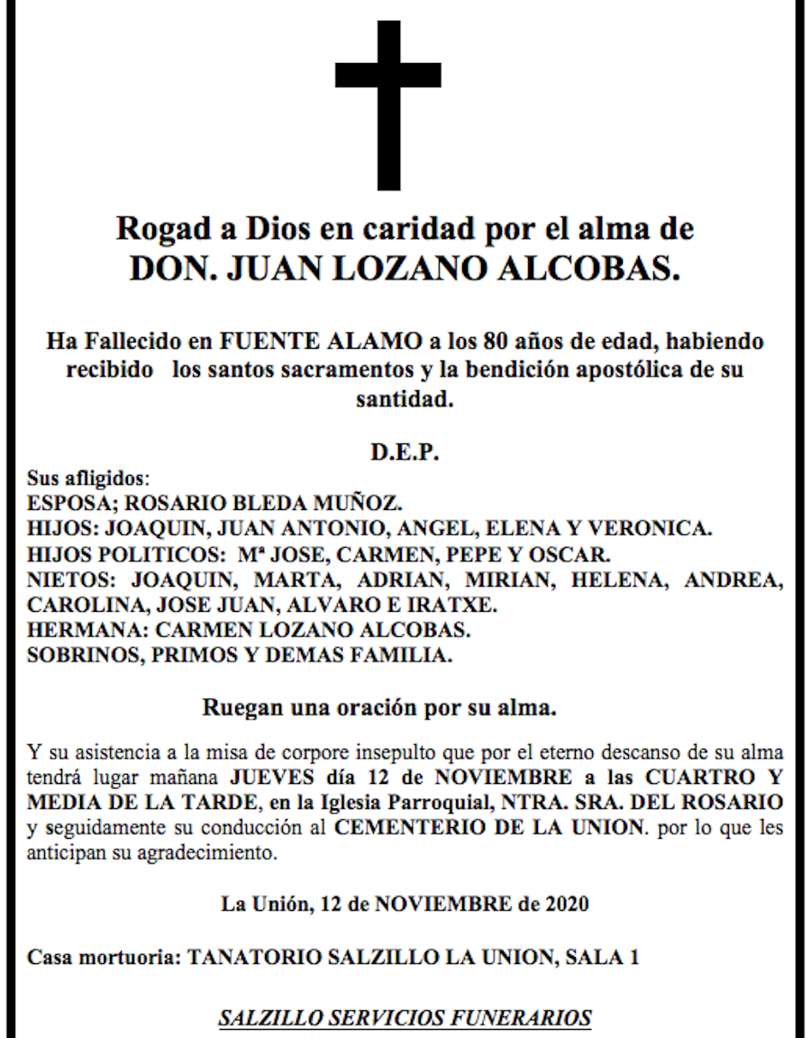 Sus afligidos esposa (Rosario Bleda Muñoz), hijos (Joaquín, Juan Antonio, Ángel, Elena y Verónica), hijos políticos (María José, Carmen, Pepe y Óscar), nietos (Joaquín, Marta, Adrián, Mirian, Helena, Andrea, Carolina, José Juan, Álvaro e Iratxe), hermana (Carmen), sobrinos, primos y demás familia ruegan una oración por su alma y su asistencia a la misa de corpore insepulto que por el eterno descanso de su alma tendrá lugar hoy, jueves día 12 de noviembre a las cuatro y media de la tarde, en la iglesia parroquial de Nuestra Señora del Rosario y seguidamente su conducción al cementerio de La Unión, por lo que les anticipan su agradecimiento.