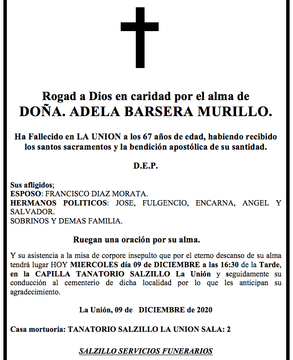 Sus afligidos esposo (Francisco Díaz Morata), hermanos políticos (José, Fulgencio, Encarna, Ángel y Salvador), sobrinos y demás familia ruegan una oración por su alma y su asistencia a la misa de corpore insepulto que por el eterno descanso de su alma tendrá lugar hoy, miércoles 9 de diciembre, a las 16:30 horas de la tarde, en la capilla de Tanatorio Salzillo La Unión y seguidamente su conducción al cementerio de dicha localidad por lo que les anticipan su agradecimiento.