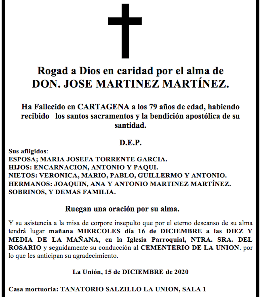 Sus afligidos esposa (María Josefa Torrente García), hijos (Encarnación, Antonio y Paqui), nietos (Verónica, Mario, Pablo, Guillermo y Antonio), hermanos (Joaquín, Ana y Antonio), sobrinos y demás familia ruegan una oración por su alma y su asistencia a la misa de corpore insepulto que por el eterno descanso de su alma tendrá lugar este miércoles, día 16 de diciembre, a las diez y media horas de la mañana, en la iglesia parroquial de Nuestra Señora del Rosario y seguidamente su conducción al cementerio de La Unión, por lo que les anticipan su agradecimiento.