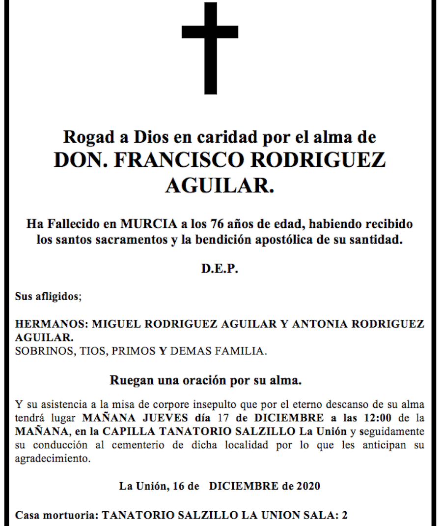 Sus afligidos hermanos (Miguel y Antonia), sobrinos, tíos, primos y demás familia ruegan una oración por su alma y su asistencia a la misa de corpore insepulto que por el eterno descanso de su alma tendrá este jueves, día 17 de diciembre, a las 12.00 horas, en la capilla Tanatorio Salzillo La Unión y seguidamente su conducción al cementerio de dicha localidad, por lo que les anticipan su agradecimiento.