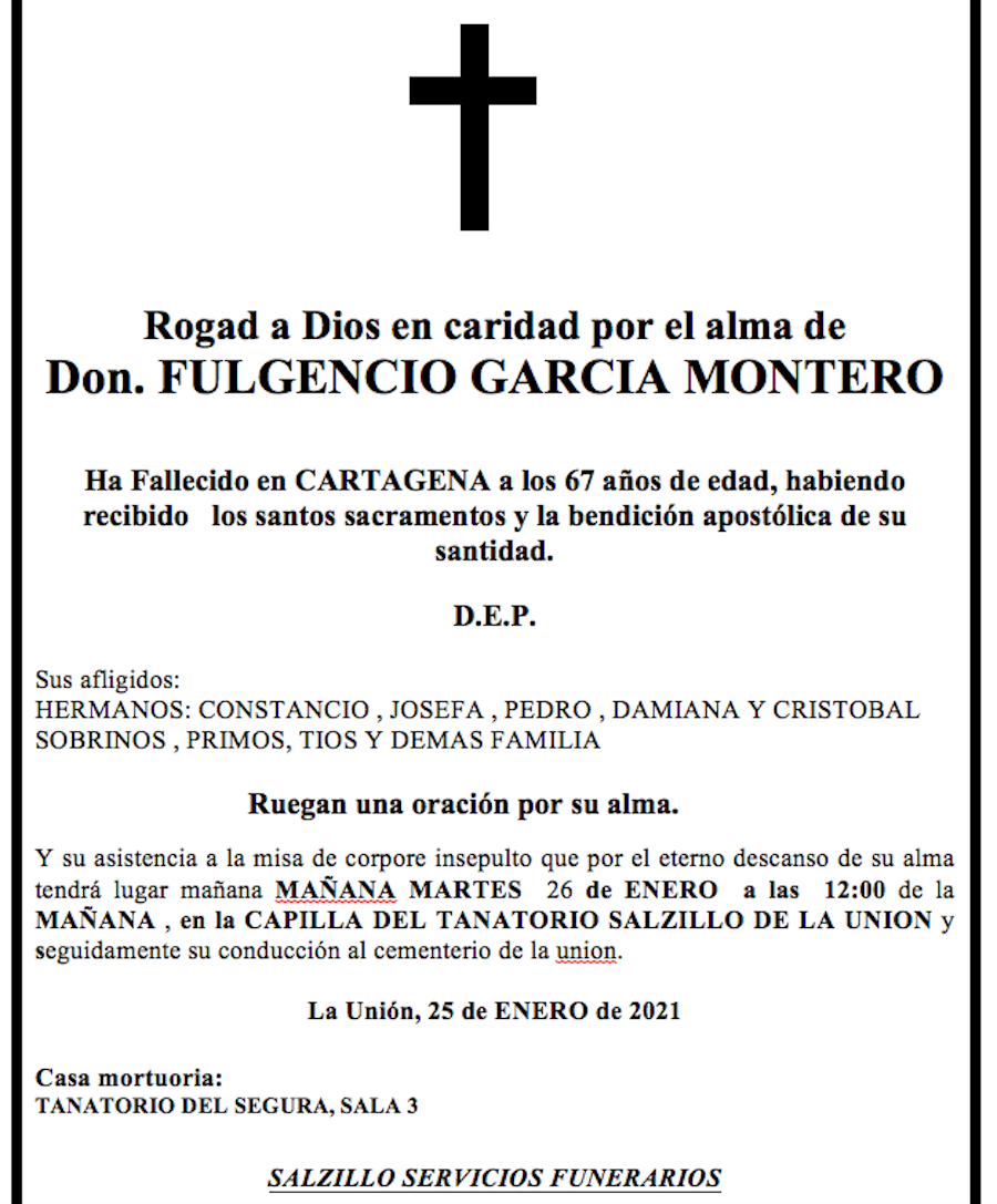 Sus afligidos hermanos (Constancio, Josefa, Pedro, Damiana y Cristóbal), sobrinos, primos, tíos y demás familia ruegan una oración por su alma y su asistencia a la misa de corpore insepulto que por el eterno descanso de su alma tendrá lugar este martes, 26 de enero, a las 12 horas en la capilla del Tanatorio Salzillo de La Unión, y seguidamente su conducción al cementerio de la union.