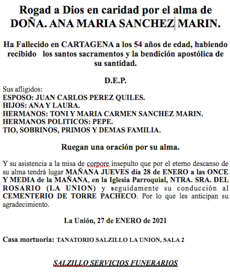 Sus afligidos esposo (Juan Carlos Pérez Quiles), hijos (Ana y Laura), hermanos (Toni y María Carmen Sánchez Marín), hermanos políticos (Pepe), tío, sobrinos, primos y demás familia ruegan una oración por su alma y su asistencia a la misa de corpore insepulto que por el eterno descanso de su alma tendrá lugar este jueves, día 28 de enero, a las once y media horas de la mañana, en la iglesia parroquial de Nuestra Señora del Rosario (La Unión) y seguidamente su conducción al cementerio de Torre-Pacheco, por lo que les anticipan su agradecimiento.