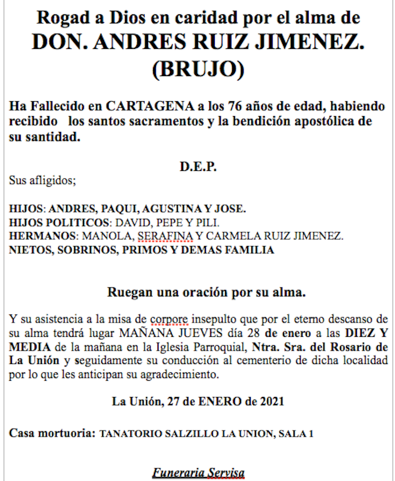 Sus afligidos hijos (Andrés, Paqui, Agustina y José), hijos políticos (David, Pepe y Pili), hermanos (Manola, Serafina y Carmela), nietos, sobrinos, primos y demás familia ruegan una oración por su alma y su asistencia a la misa de corpore insepulto que por el eterno descanso de su alma tendrá lugar este jueves, día 28 de enero, a las diez y media horas de la mañana, en la iglesia parroquial de Nuestra Señora del Rosario de La Unión y seguidamente su conducción al cementerio de dicha localidad por lo que les anticipan su agradecimiento.