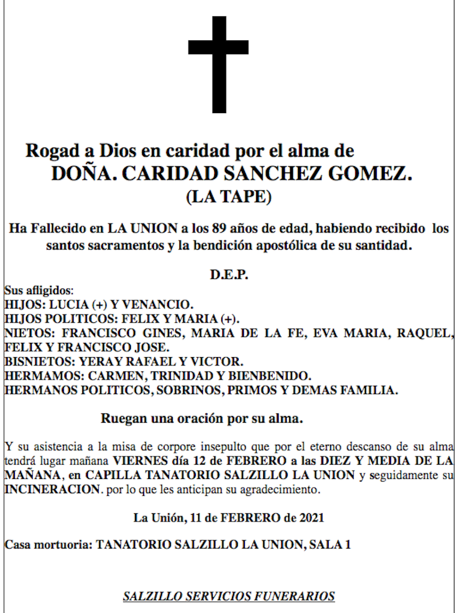 Sus afligidos hijos (Lucía+ y Venancio), hijos políticos (Félix y María+), nietos (Francisco Ginés, María de la Fe, Eva María, Raquel, Félix y Francisco José), bisnieetos (Yeray Rafael y Víctor), hermanos (Carmen, Trinidad y Benvenido), hermanos políticos, sobrinos, primos y demás familia ruegan una oración por su alma y su asistencia a la misa de corpore insepulto que por el eterno descanso de su alma tendrá lugar este viernes, día 12 de febrero, a las diez y media de la mañana, en capilla tanatorio Salzillo de La Unión y seguidamente su incineración, por lo que les anticipan su agradecimiento.