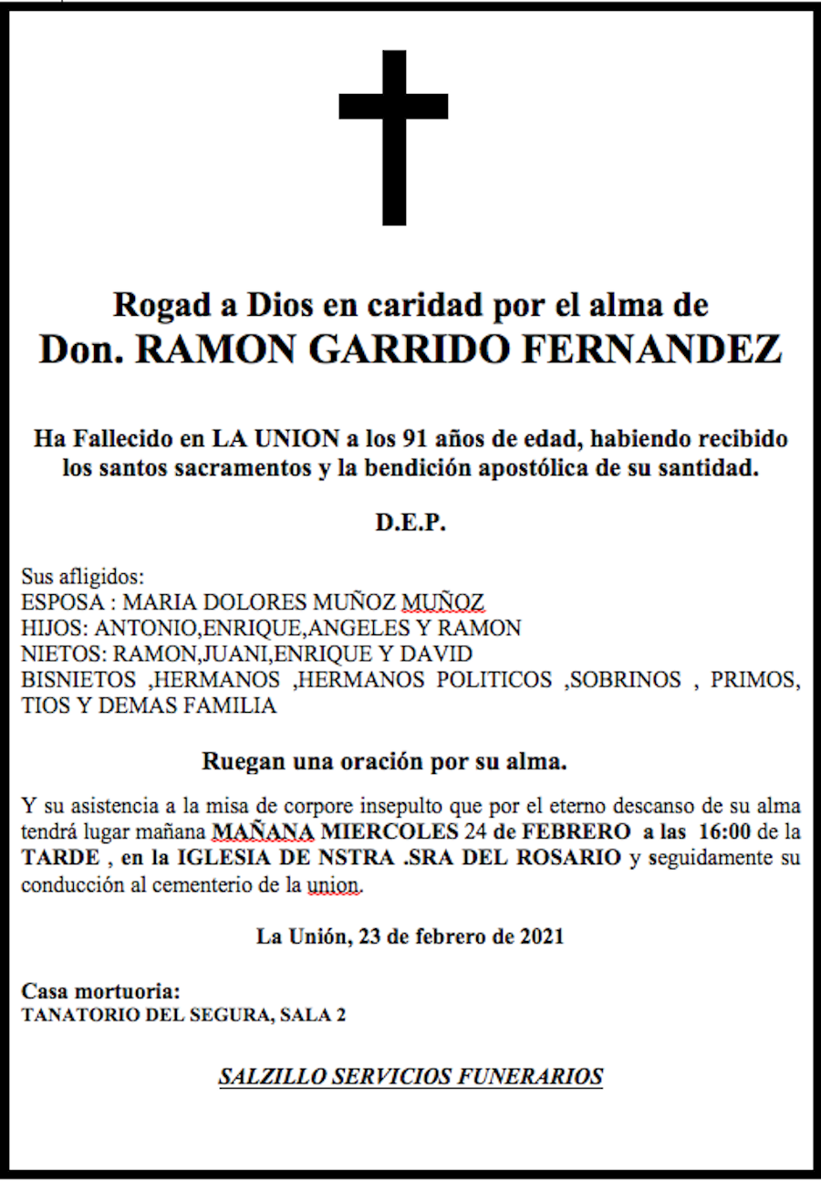 Sus afligidos esposa (María Dolores Muñoz Muñoz), hijos (Antonio, Enrique, Ángeles y Ramón), nietos (Ramón, Juani, Enrique y David), bisnietos, hermanos, hermanos políticos, sobrinos, primos, tíos y demás familia ruegan una oración por su alma y su asistencia a la misa de corpore insepulto que por el eterno descanso de su alma tendrá lugar este miércoles, 24 de febrero, a las 16.00 horas, en la iglesia de Nuestra Señora del Rosario y seguidamente su conducción al cementerio de La Union.