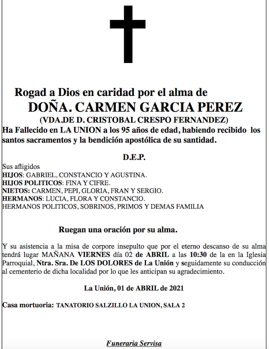 Sus afligidos hijos (Gabriel, Constancio y Agustina), hijos políticos (Fina y Cifre), nietos (Carmen, Pepi, Gloria, Fran y Sergio), hermanos (Lucía, Flora y Constancio), hermanos políticos, sobrinos, primos y demás familia ruegan una oración por su alma y su asistencia a la misa de corpore insepulto que por el eterno descanso de su alma tendrá lugar este viernes, día 2 de abril, a las 10:30 horas de la mañana en la iglesia parroquial de Nuestra Señora de los Dolores de La Unión y seguidamente su conducción al cementerio de dicha localidad por lo que les anticipan su agradecimiento.