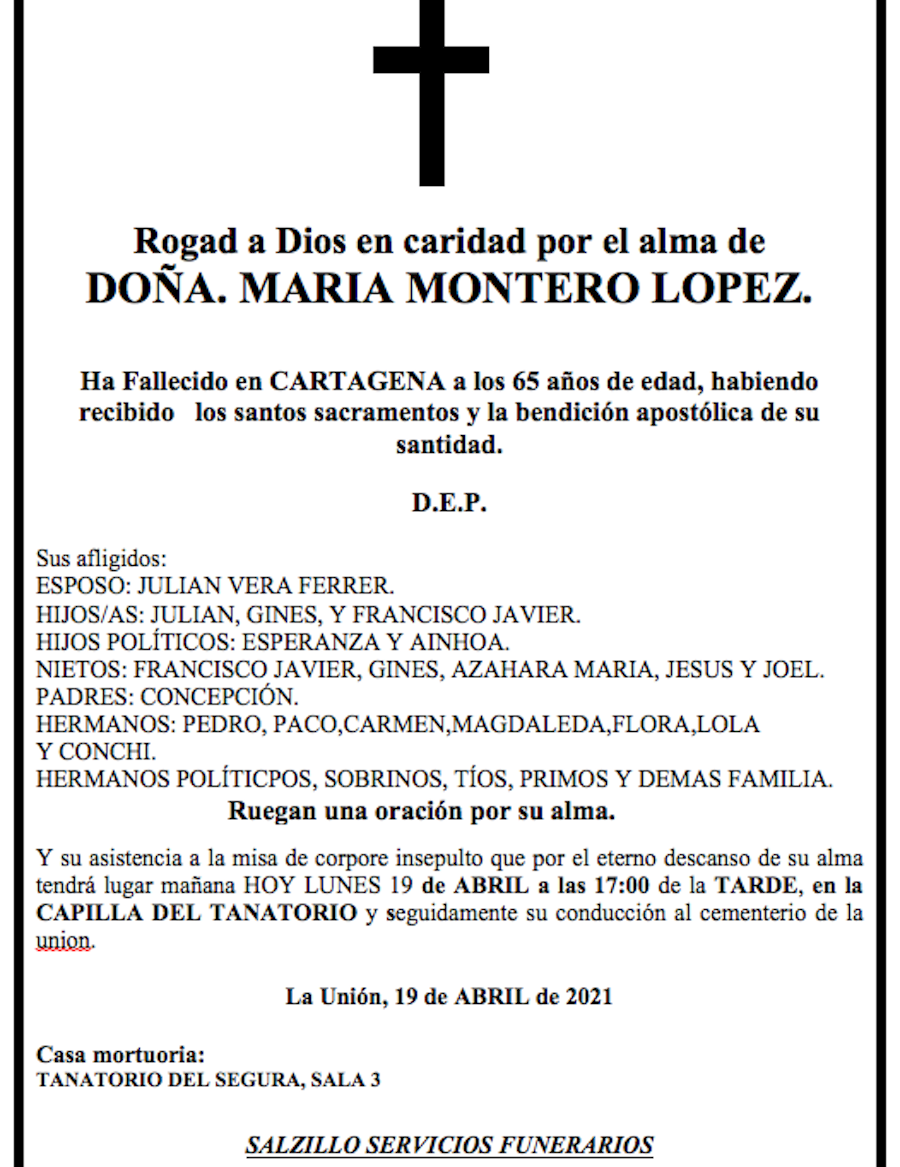 Sus afligidos esposo (Julián Vera Ferrer), hijos (Julián, Ginés y Francisco Javier), hijos políticos (Esperanza y Ainhoa), nietos (Francisco Javier, Ginés, Azahara María, Jesús y Joel), madre (Concepción), hermanos (Pedro, Paco, Carmen, Magdalena, Flora, Lola y Conchi), hermanos políticos, sobrinos, tíos, primos y demás familia ruegan una oración por su alma y su asistencia a la misa de corpore insepulto que por el eterno descanso de su alma tendrá lugar mañana hoy, lunes 19 de de abril, a las 17 horas de la tarde, en la capilla del tanatorio y, seguidamente, su conducción al cementerio de La Union.