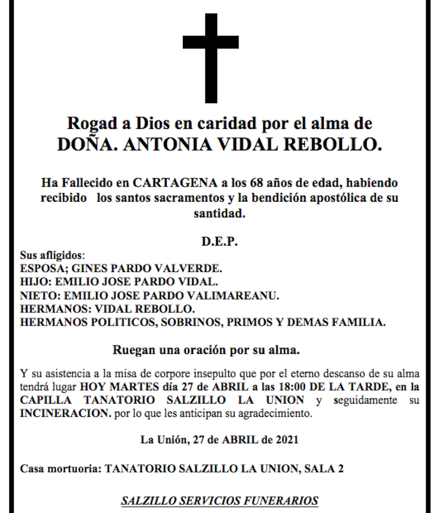 Sus afligidos esposo (Ginés Pardo Valverde), hijo (Emilio), nieto (Emilio José Pardo Valimareanu), hermanos, hermanos políticos, sobrinos, primos y demás familia ruegan una oración por su alma y su asistencia a la misa de corpore insepulto que por el eterno descanso de su alma tendrá lugar hoy, martes, a las 18:00 horas, en la capilla del Tanatorio Salzillo La Unión y seguidamente su incineración, por lo que les anticipan su agradecimiento.