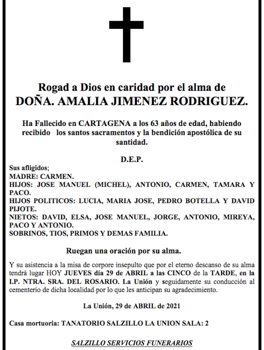 Sus afligidos madre (Carmen), hijos (José Manuel 'Míchel', Antonio, Carmen, Tamara y Paco), hijos políticos (Lucía, María José, Pedro Botella y David Pijote), nietos (David, Elsa, José Manuel, Jorge, Antonio, Mireya, Paco y Antonio), sobrinos, tíos, primos y demás familia ruegan una oración por su alma y su asistencia a la misa de corpore insepulto que por el eterno descanso de su alma tendrá lugar hoy, jueves día 29 de abril, a las cinco de la tarde, en la iglesia parroquial de Nuestra Señora del Rosario de La Unión y seguidamente su conducción al cementerio de dicha localidad por lo que les anticipan su agradecimiento.