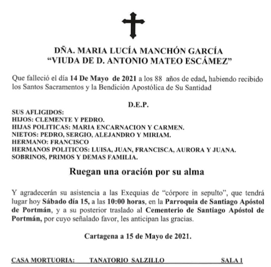 Sus afligidos hijos (Clemente y Pedro), hijos políticos (María Encarnación y Carmen), nietos (Pedro, Sergio, Alejandro y Miriam), hermano (Francisco), hermanos políticos (Luisa, Juan, Francisca, Aurora y Juana), sobrinos, primos y demás familia ruegan una oración por su alma y su asistencia a la misa de corpore insepulto que por el eterno descanso de su alma tendrá lugar este sábado, 15 de mayo, a las 10 horas de la mañana, en la iglesia de Santiago Apóstol de Portmán (La Unión) y seguidamente su conducción al cementerio de Portmán.