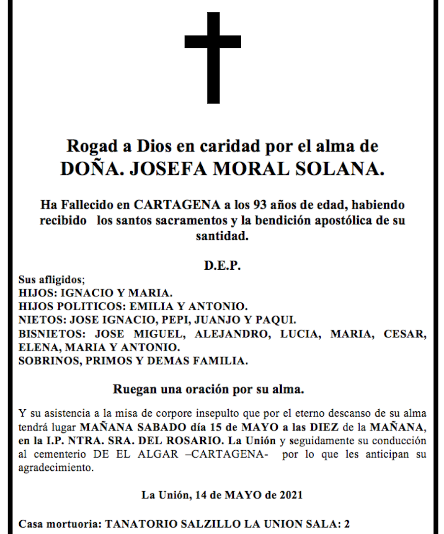 Sus afligidos hijos (Ignacio y María), hijos políticos (Emilia y Antonio), nietos (José Ignacio, Pepi, Juanjo y Paqui), bisnietos (José Miguel, Alejandro, Lucía, María, César, Elena, María y Antonio), sobrinos, primos y demás familia ruegan una oración por su alma y su asistencia a la misa de corpore insepulto que por el eterno descanso de su alma tendrá lugar este sábadoo, día 15 de mayo, a las diez de la mañana, en la iglesia parroquial de Nuestra Señora del Rosario (La Unión) y, seguidamente, su conducción al cementerio de El Algar (Cartagena), por lo que les anticipan su agradecimiento.